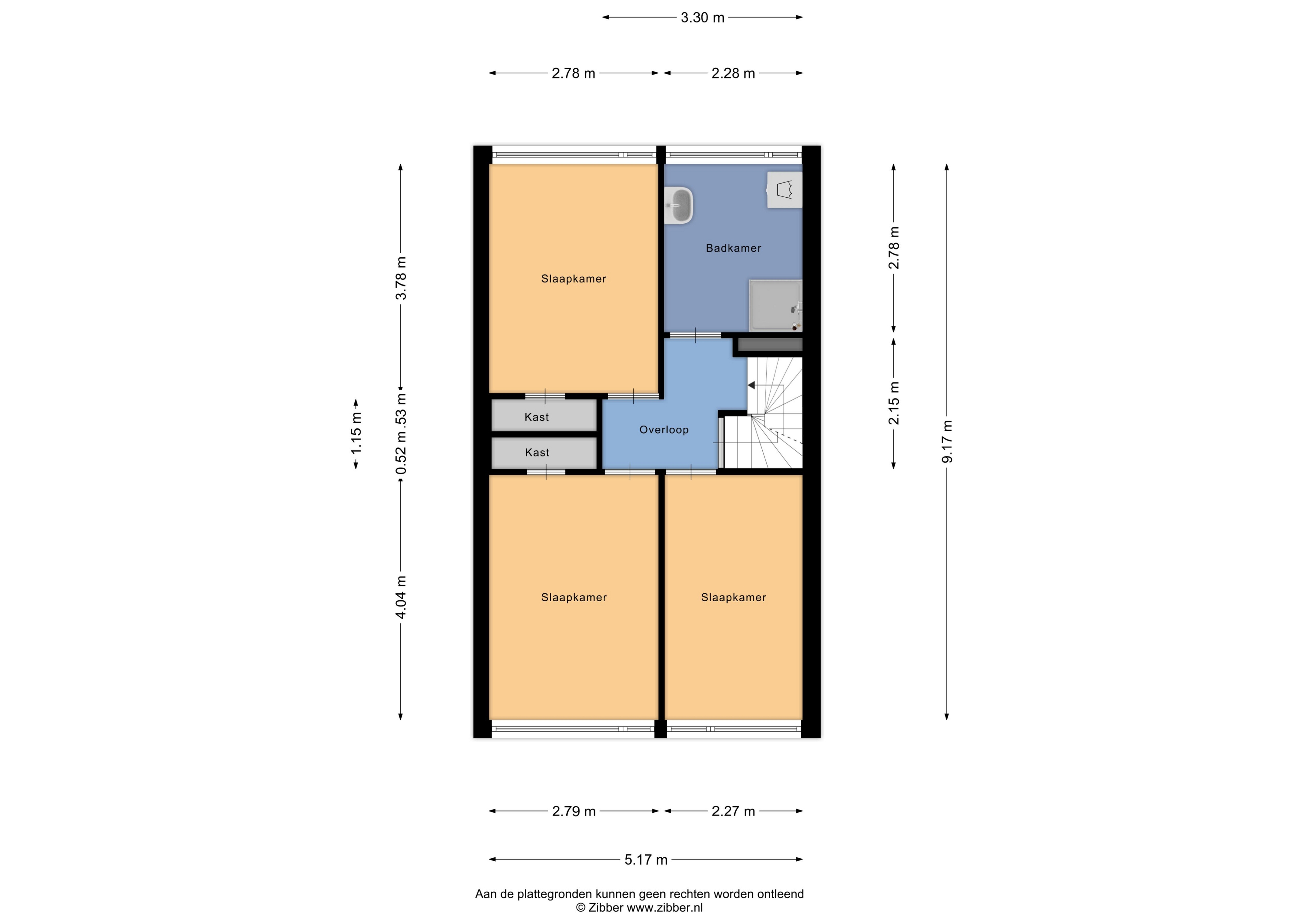 De overloop geeft toegang tot 3 slaapkamers en de ruime volledig betegelde badkamer met douche, wastafel en wasmachineaansluiting.