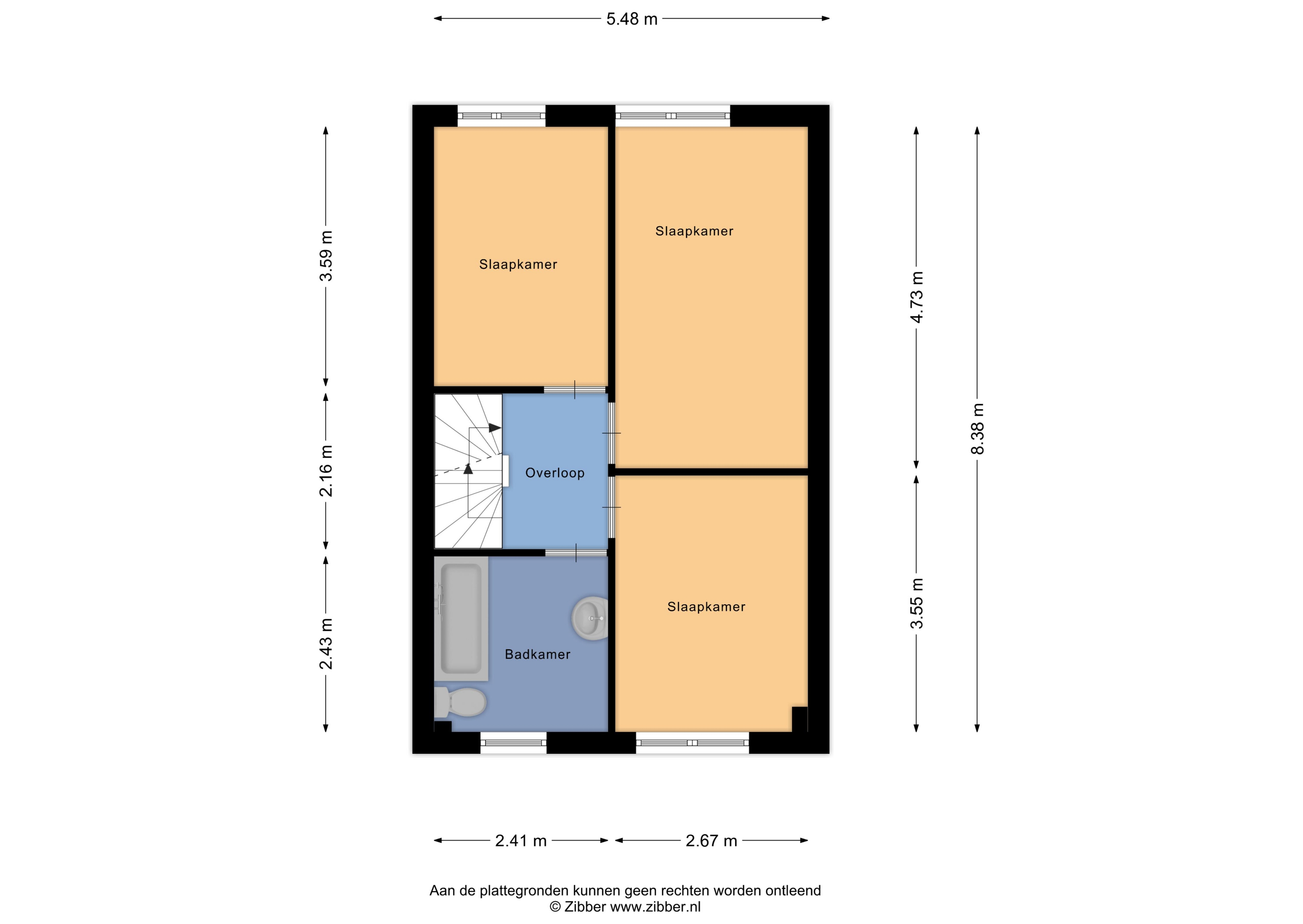 Vanaf de overloop bereik je 3 slaapkamers en de eenvoudige badkamer met ligbad, wastafel, wasmachineaansluiting en 2e toilet.
