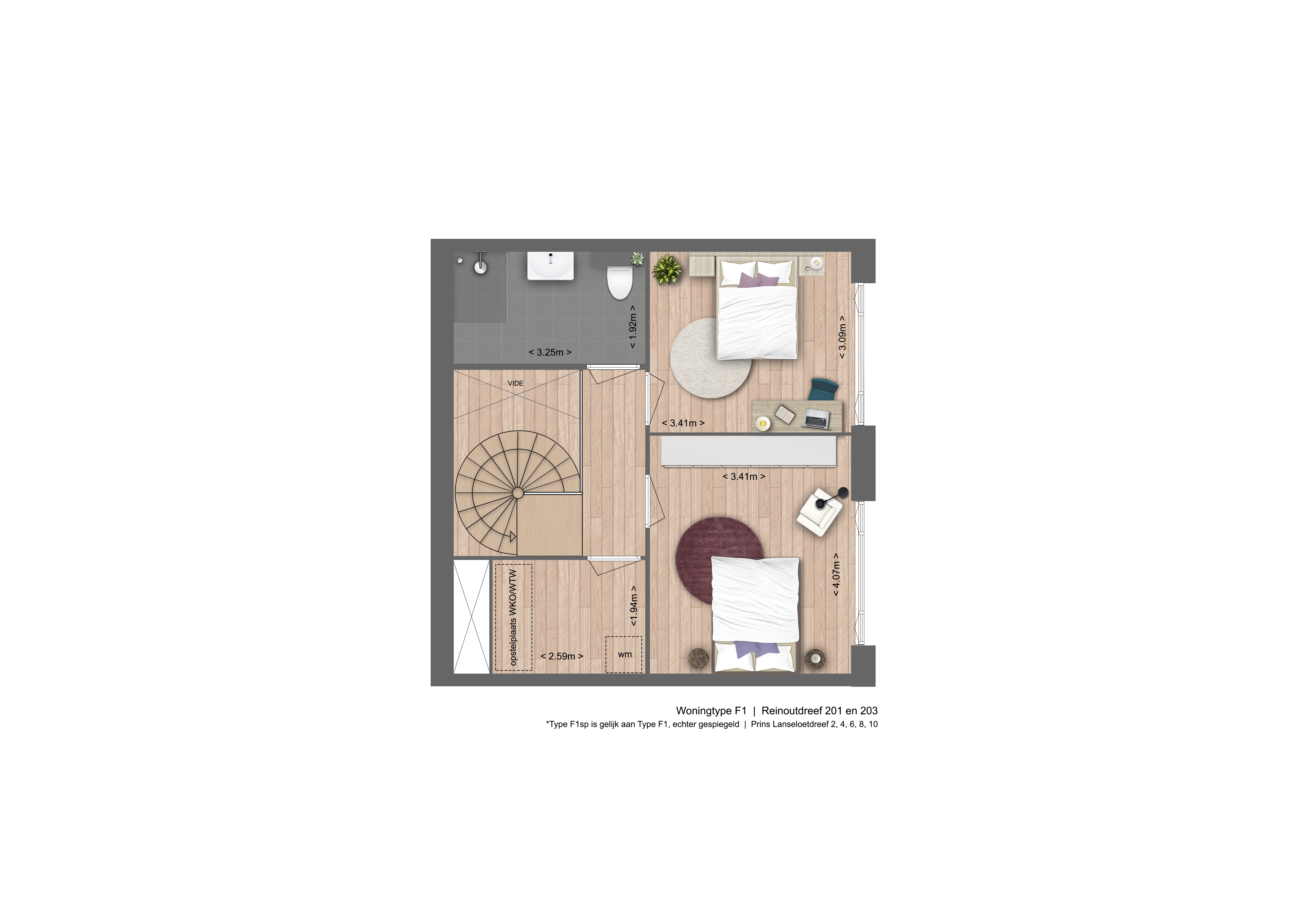 De tweede verdieping bereik je ook via de spiltrap. Hier vind je twee comfortabele slaapkamers en een moderne badkamer met een douche, wastafel en tweede toilet. Daarnaast is er een aparte ruimte met een wasmachineaansluiting en plek voor de warmte-koude installatie en de warmteterugwininstallatie.