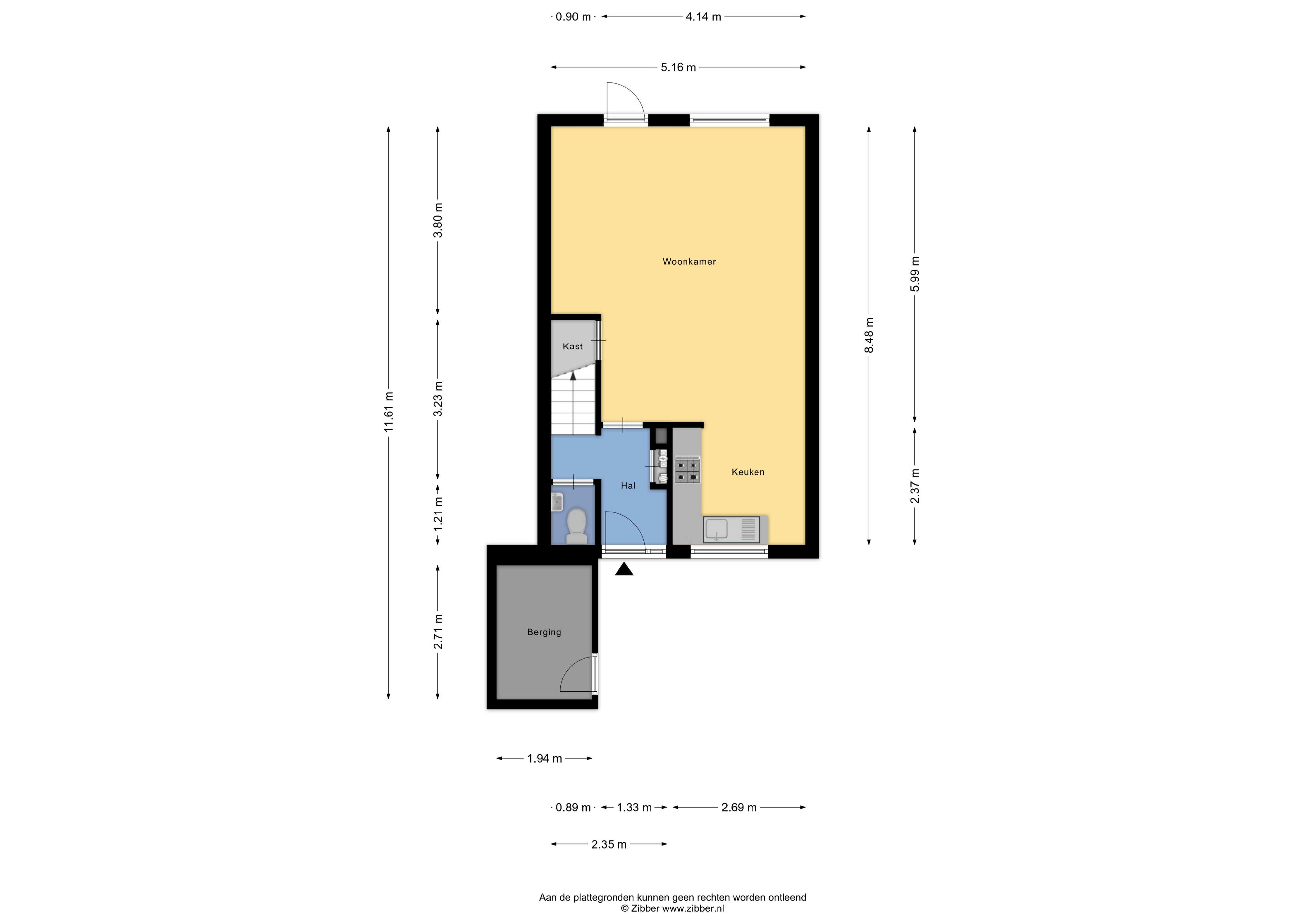 De afgesloten keuken is voorzien van een eenvoudig keukenblok en is aan de voorzijde van de woning gelegen. In de hal vind je ook het toilet en de trap naar boven. De achtertuin ligt op het zuiden en is voorzien van een houten tuinberging. Aan de voorzijde is een stenen fietsenberging aanwezig.